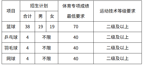 (三)达到学校文化和体育专项成绩最低录取控制线的考生,学校依据上线考生填报的志愿梯次顺序,分项目按照综合分由高到低录取,优先录取第一志愿考生。如未完成招生计划,再根据相同录取原则录取第二志愿考生。如第二志愿录取结束,仍未完成招生计划,不再进行计划的调整。综合分相同时,录取体育专项成绩高者;体育专项成绩仍相同时,按文化成绩中的数学、英语、语文依次排序录取。